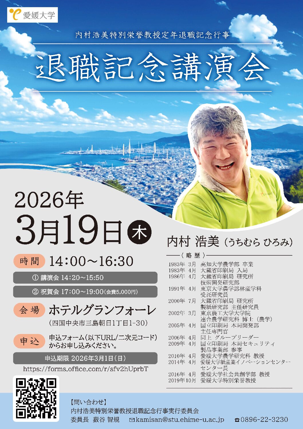 開催日時 2026年3月19日(木)14:00~16:30 会 場 ホテルグランフォーレ (愛媛県四国中央市三島朝日1丁目1-30) この度、内村 浩美教授(現紙産業イノベーションセンター長)が、令和8年3月31日をもちまして、定年退職を迎えられます。 ...