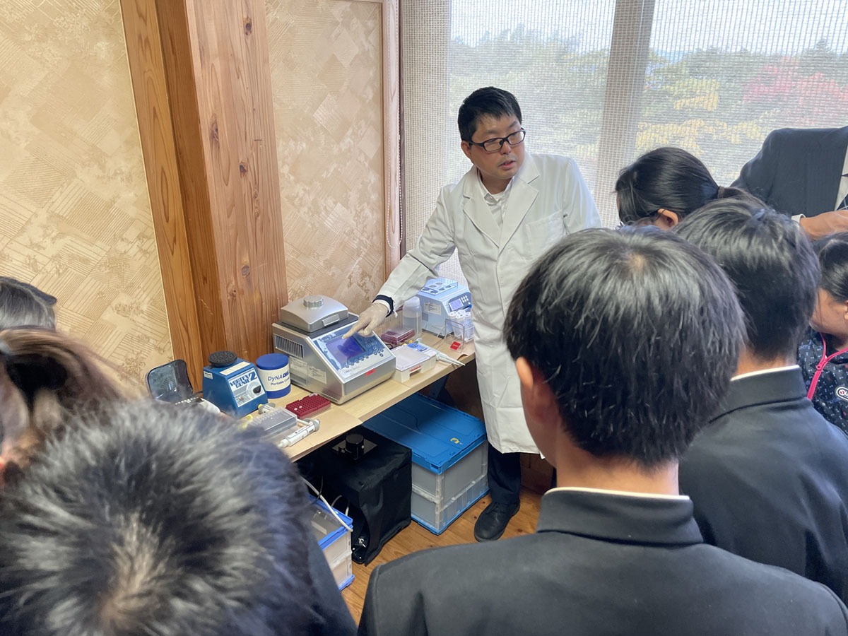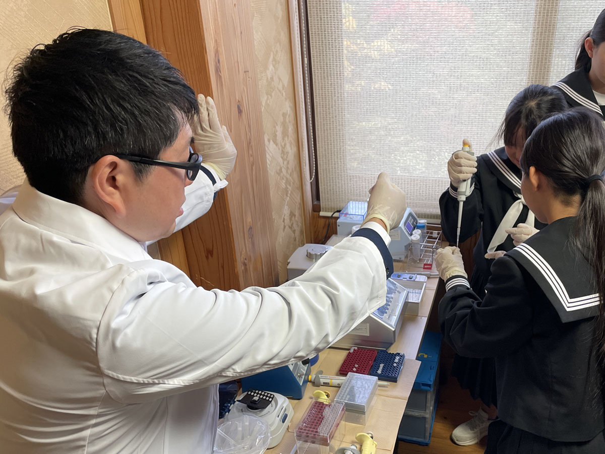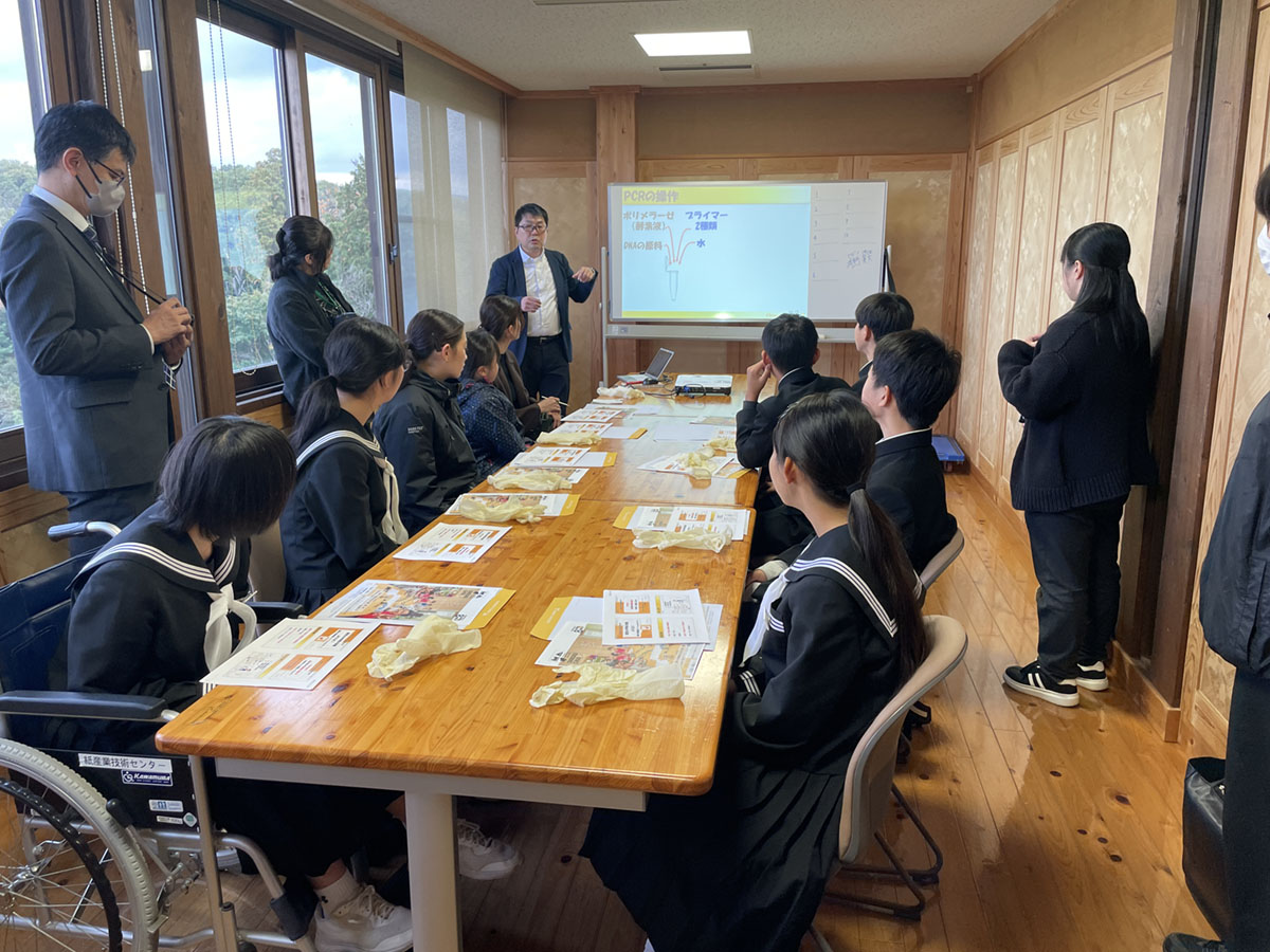 授業では、PCRの原理や操作方法を実演しながら説明し、生徒には、紙の主成分であるセルロースを分解する酵素「セルラーゼ」のDNAを増幅する実験を行っていただきました。皆様、実験のポイントを興味深く聞きながら、生徒同士で協力しながら作業を進めていました。