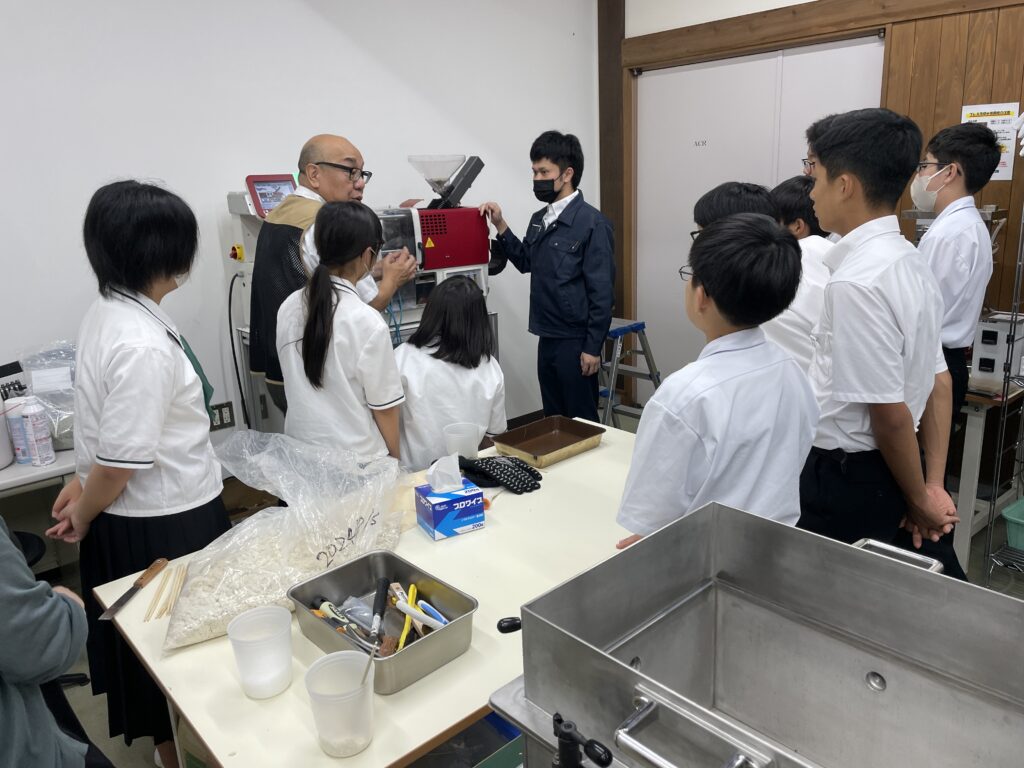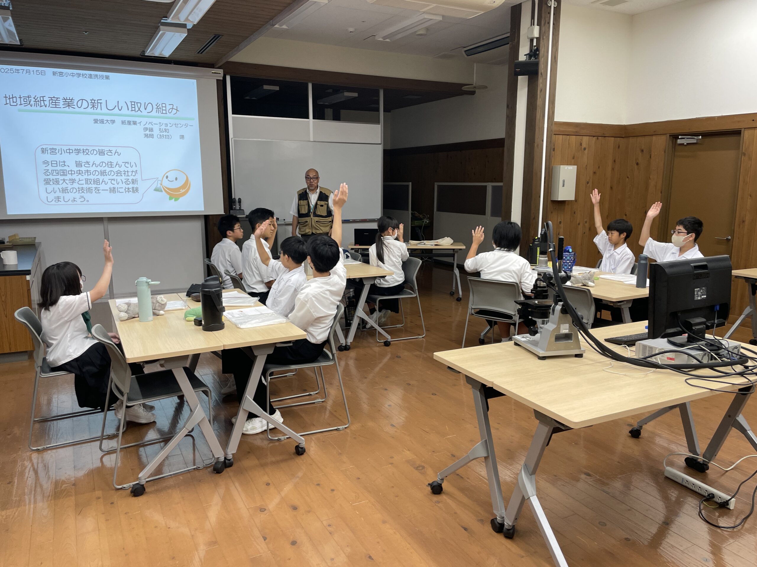令和7年7月15日(火)、四国中央市立新宮小・中学校の中学1年生9名が紙産業イノベーションセンターに来訪され、伊藤 弘和准教授による課外授業が行われました。授業では『地域紙産業の新しい取り組み』と題して、プラスチックと植物材料であるパルプの混錬およびそれを用いた製品製造体験を行いました。