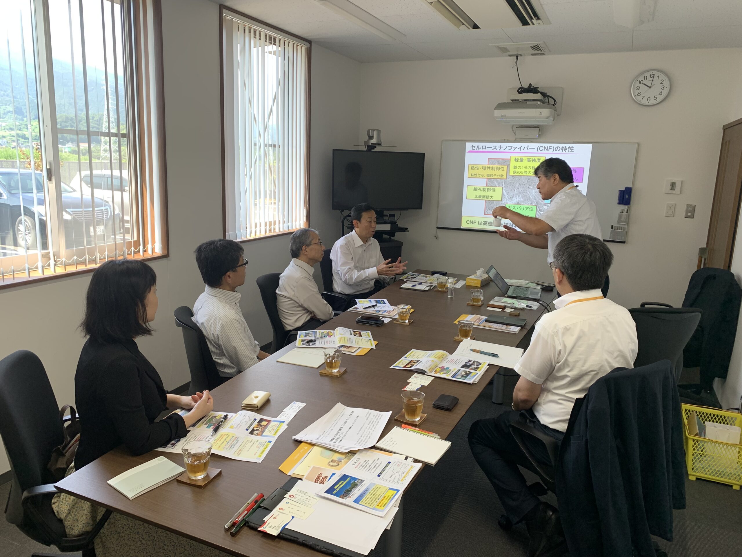 当日は、内村浩美センター長が、製品サンプルを交えながら紙産業の現状と当センターの活動概要、そして今後の展望について説明を行いました。特に、研究活動の一例として、セルロースナノファイバー(CNF)を用いた自動車部品や医療用デバイス、インキ消去機能紙などの研究開発事例を中心に紹介しました。