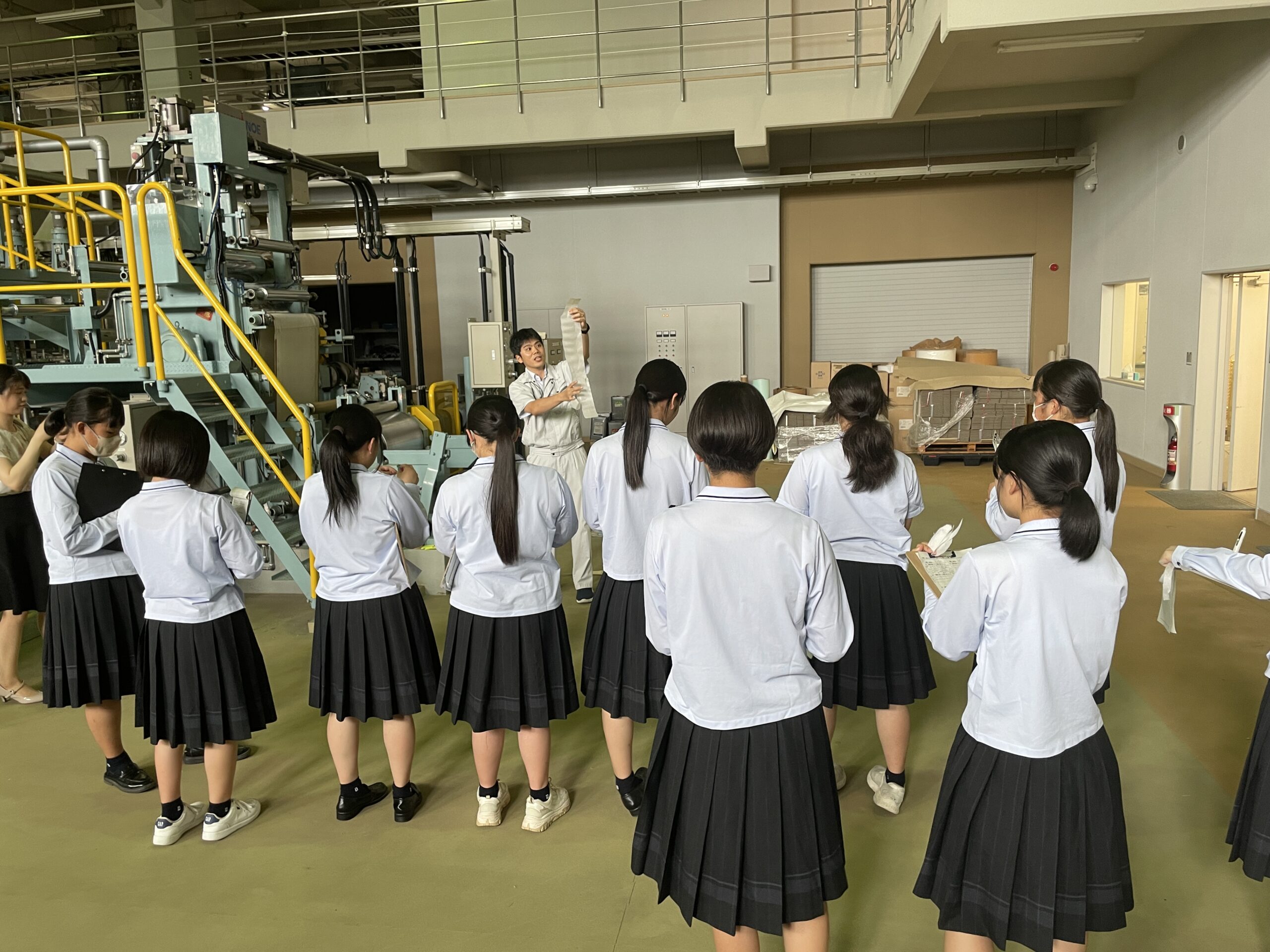 愛媛県紙産業技術センター主任研究員 藤本 真人 氏より、同センター実験棟の案内をしていただきました。抄紙機や不織布製造装置、塗工機等、実製造に近い形で紙を抄造できる機器類に生徒の皆様は目を輝かせていました。また、企業等からの要望を受け、紙製品の試作を担っていることを説明していただきました。