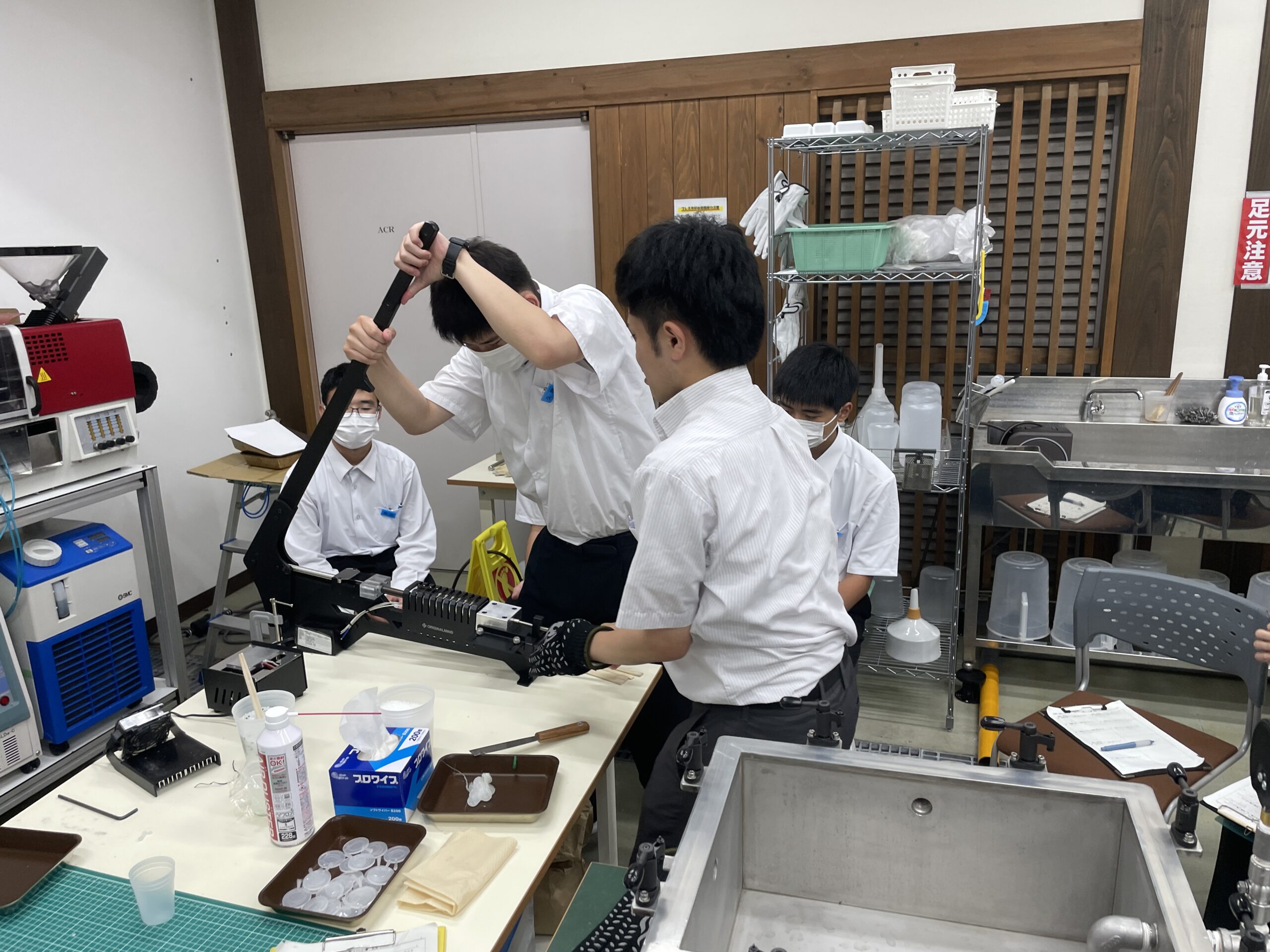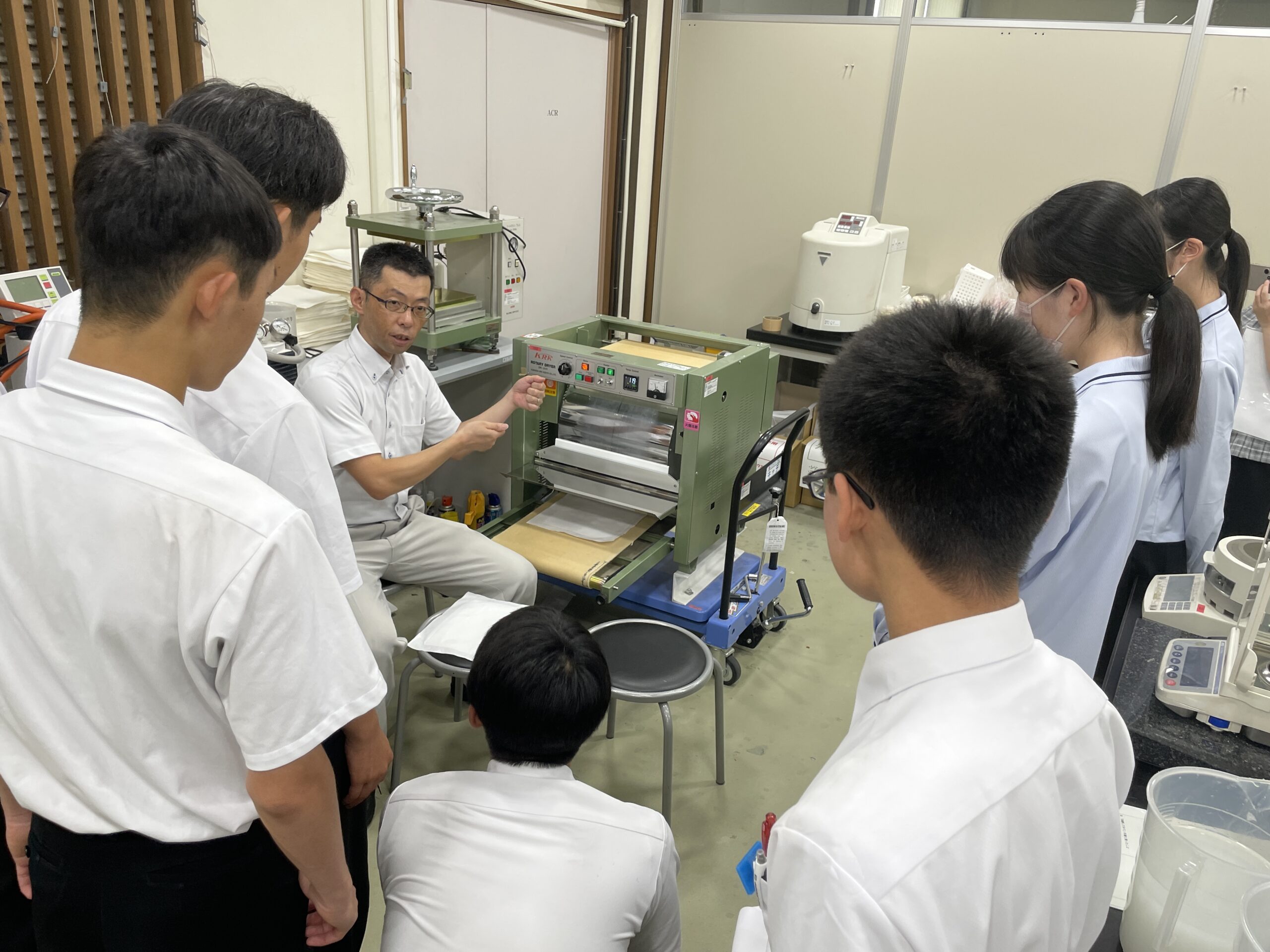 深堀 秀史 准教授が、生徒の皆様に、原料から紙が抄造されるまでをレクチャーし、皆様にも実際に紙の抄造を行ってもらいました。熱源やプレス機等の扱いに注意を払いながら、小型の抄紙機で紙抄きを体験してもらい、うまくできた際には喜びを見せるなど楽しみながら取り組んでいました。さらに、紙パルプに乳脂肪分を混ぜることにより、水をはじく機能を持った紙の抄造を実演すると、皆様、同じような紙でも違う機能を持つ紙に驚きを見せていました。