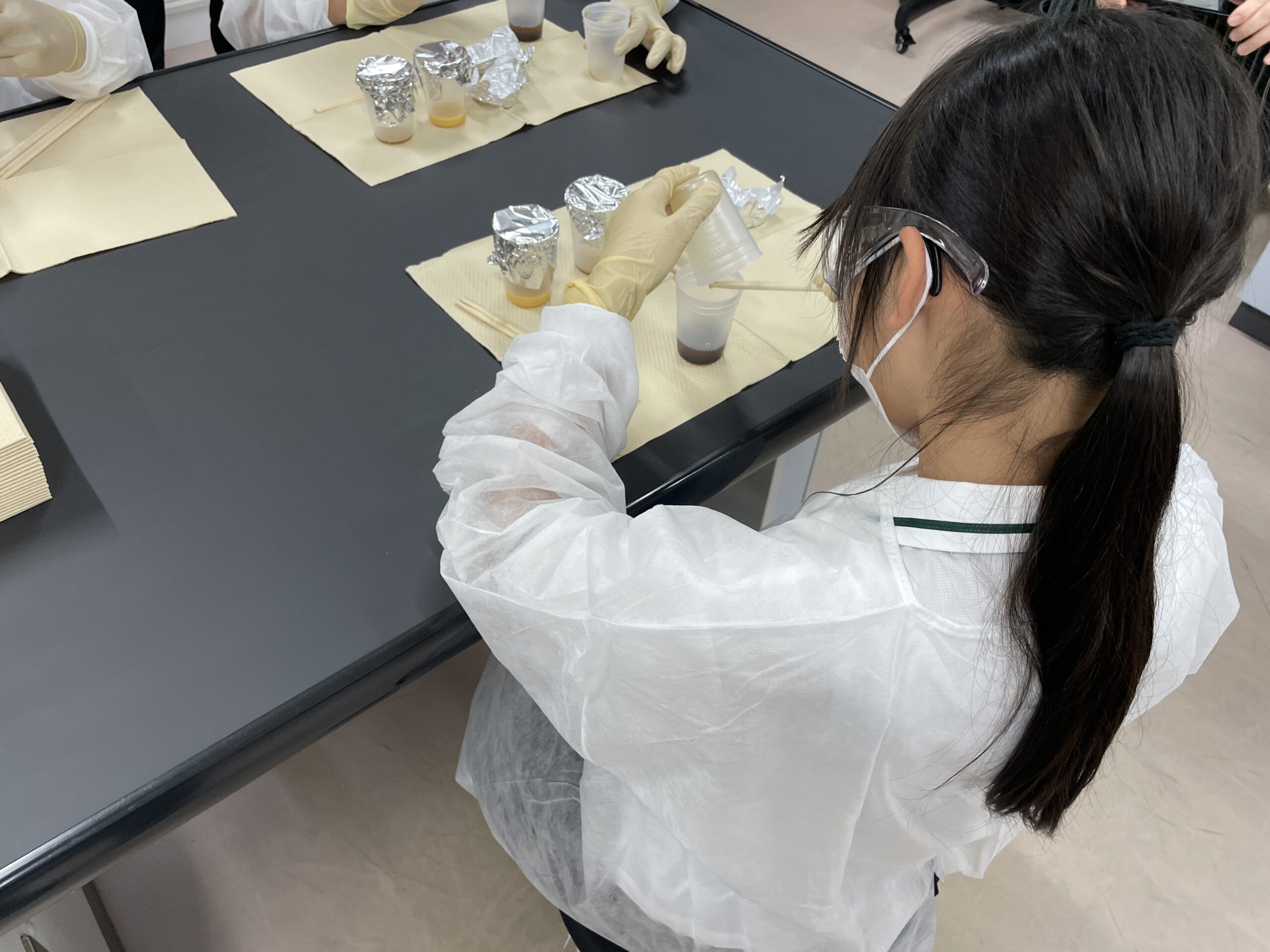 また、モノマーは一つの物質だけでできている場合と、複数の物質が影響し合ってできている場合があります。複数の物質が組み合わさることで、より性能の良いプラスチックを作ることが可能です。例えば、ウレタンは複数の物質から構成されるモノマーの一つです。授業では、このウレタンの構造を変化させることで、軟らかさの異なるウレタンフォームを合成する実験も行いました。皆様、薬品の扱いに注意を払いながら実験を進め、同じモノマー(ウレタン)でも異なる性能を持つことに驚きの表情を見せていました。