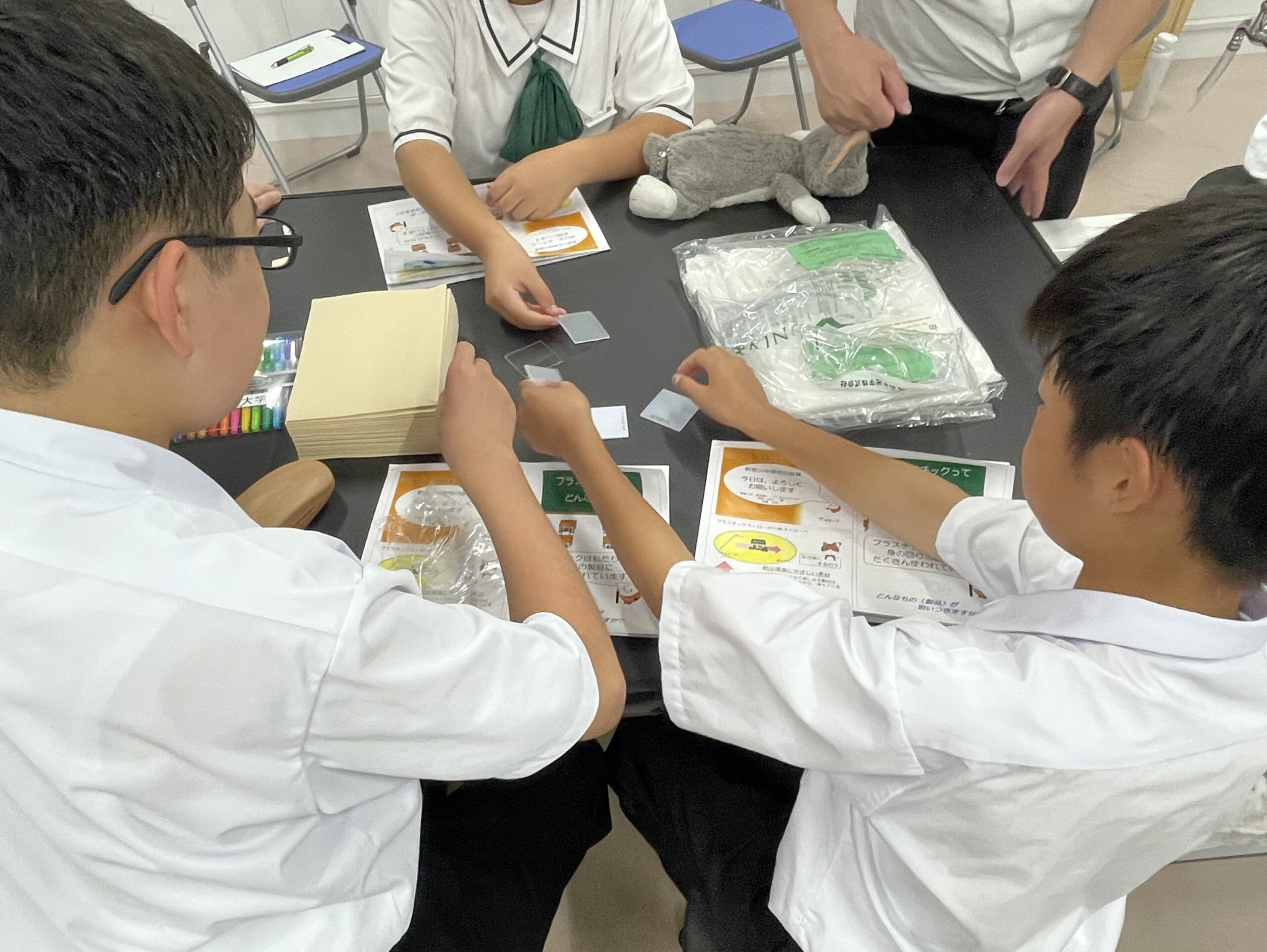 最後に、プラスチックは私たちの生活を支える便利な素材である一方で、海洋汚染などの環境問題もあることを紹介しました。ただし、「リデュース」「リユース」「リサイクル」の3Rの取り組みにより、適切に扱うことで環境問題に対処できることも伝えました。また、授業で学んだように、プラスチックにはさまざまな種類があるため、ゴミの分別をしっかり行うことがリサイクルを促進し、環境保護につながることも伝えました。