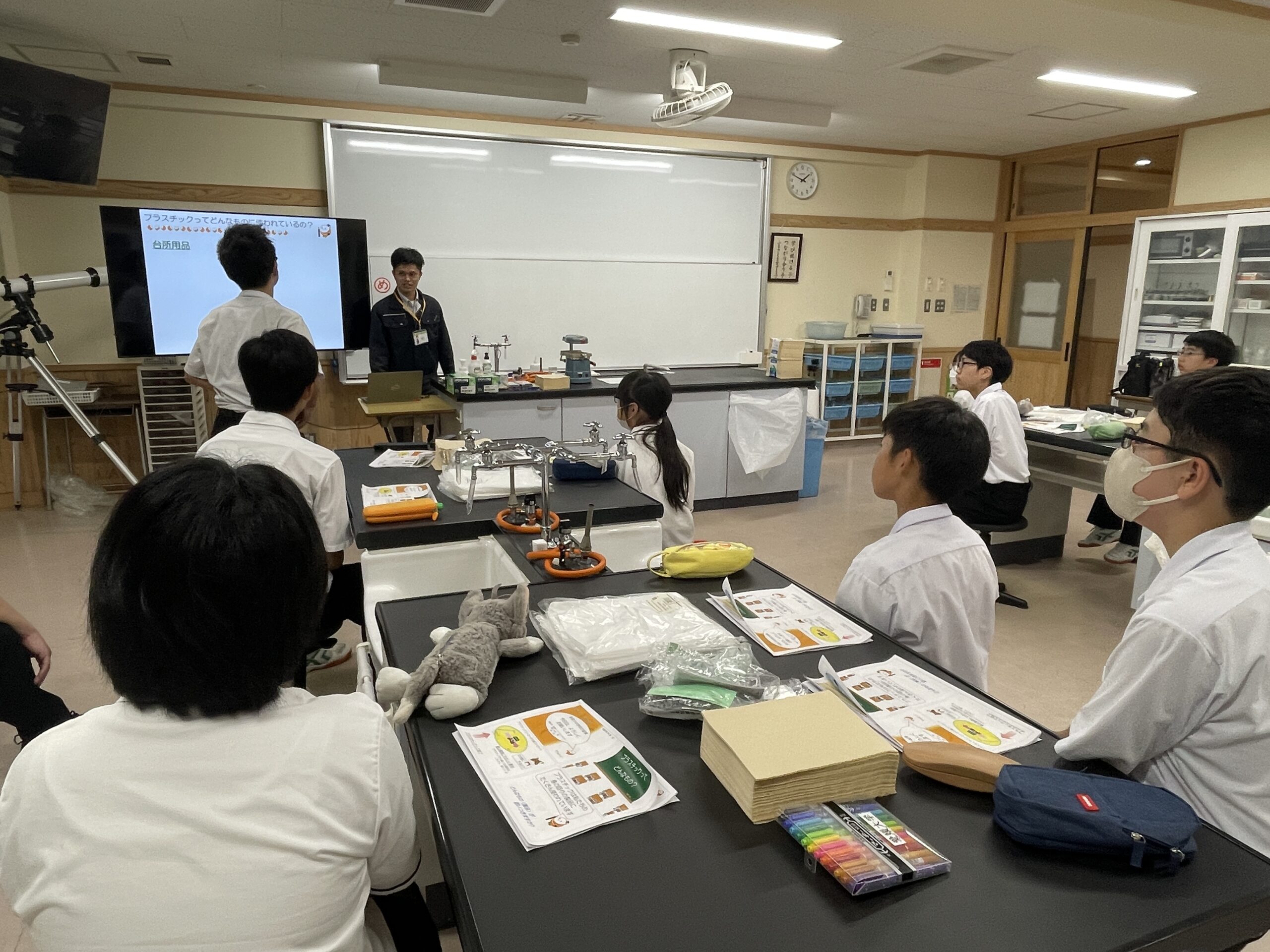 私たちの身の回りでは、飲食店のストロー等のように、プラスチック素材から紙素材への代替が進んでいます。紙素材の原料となる木は、伐採しても再度育てることができ、環境に優しい「循環資源」と呼ばれています。一方で、代替が進んでいる、プラスチックはどのようなものなのか、その特徴を紹介することを目的に授業が始まりました。